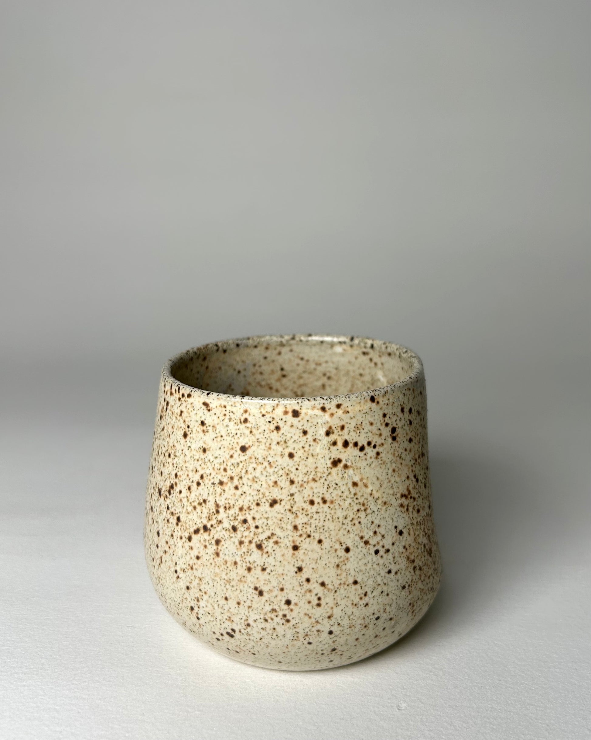 This tumbler has a gentle thumb imprint on one side and it is so very nice to hold. This cup has lots of wild speckles under an off white / yellowish glaze. Nice drips. Good for either cold or warm drinks. Microwave + Dishwasher safe.
