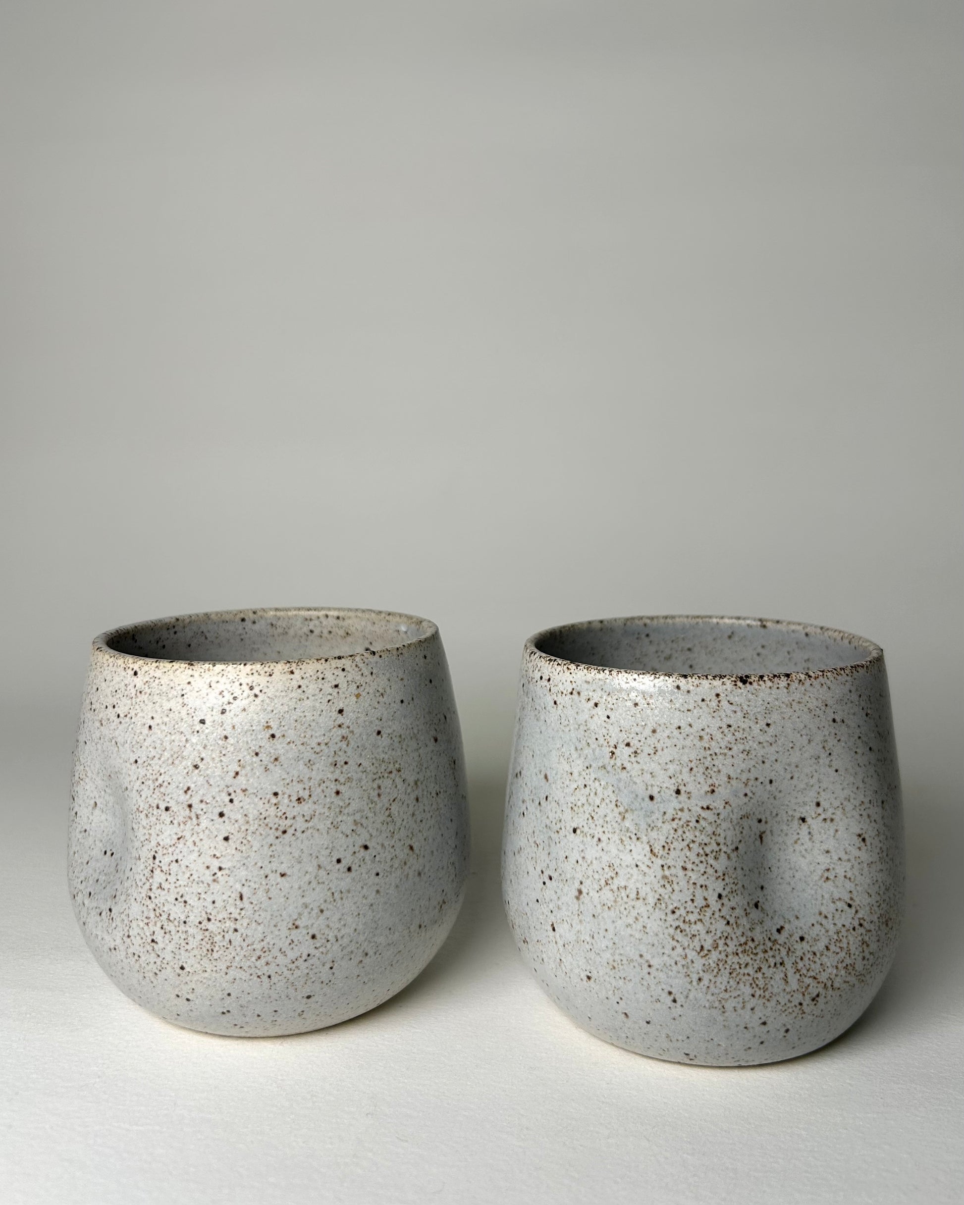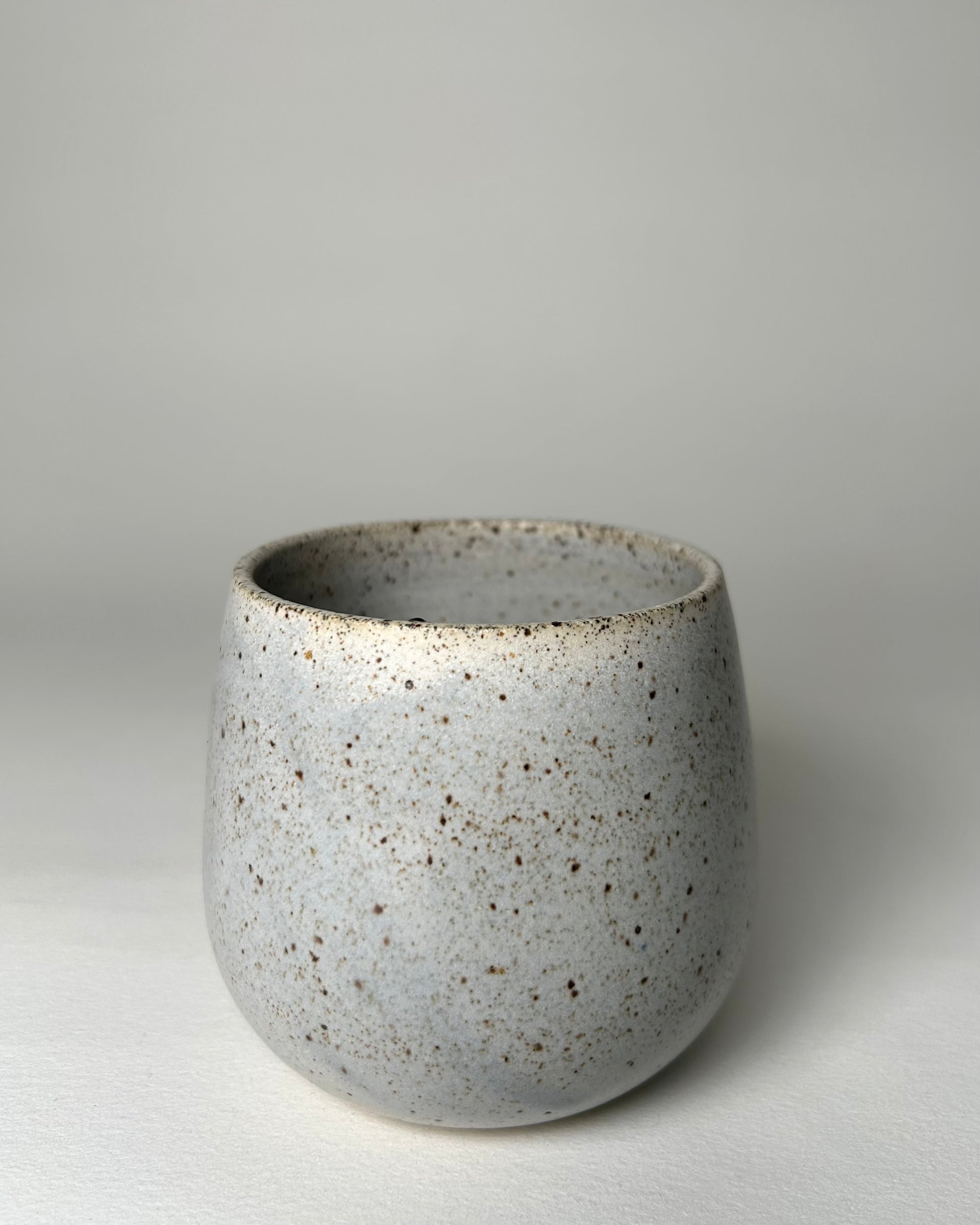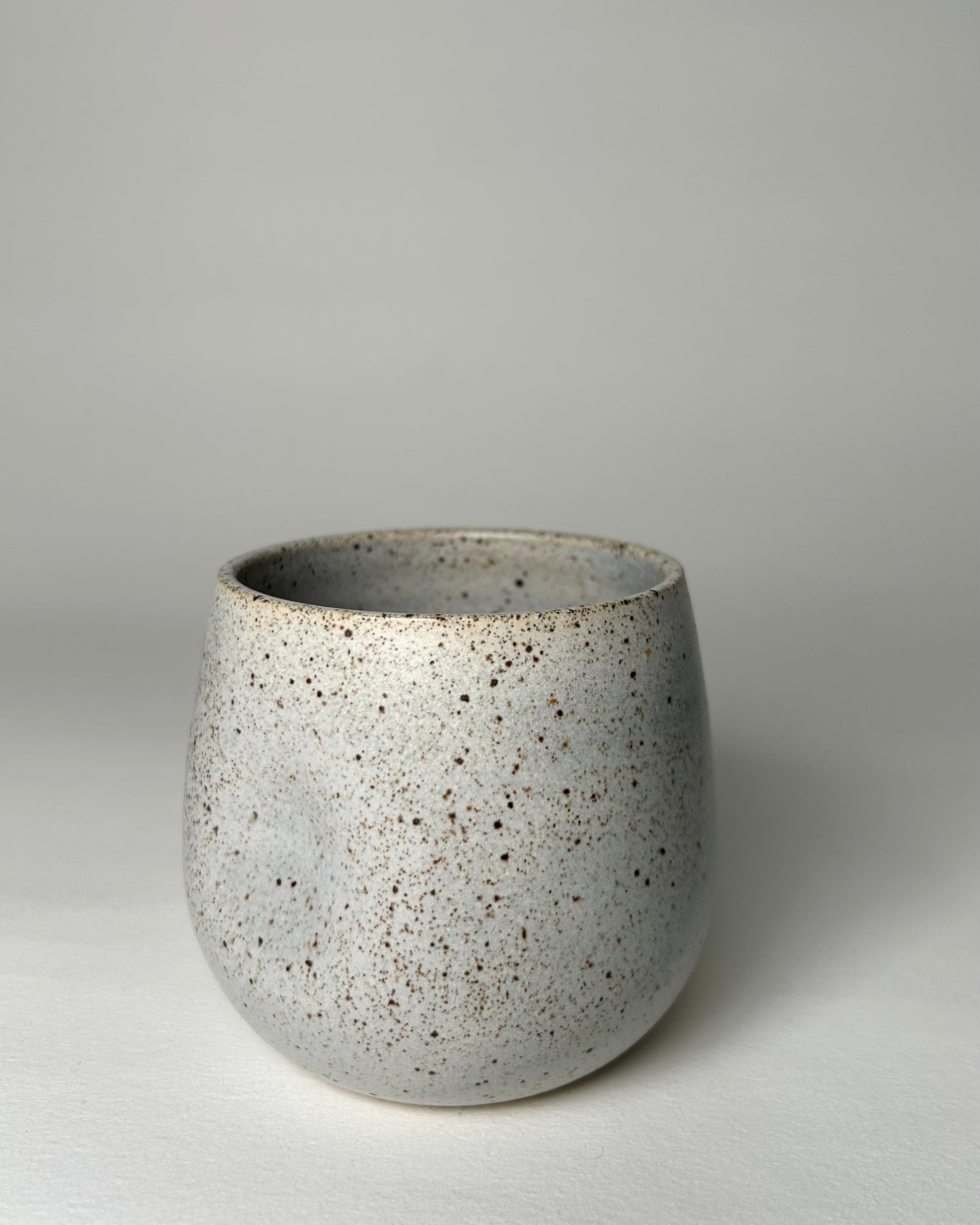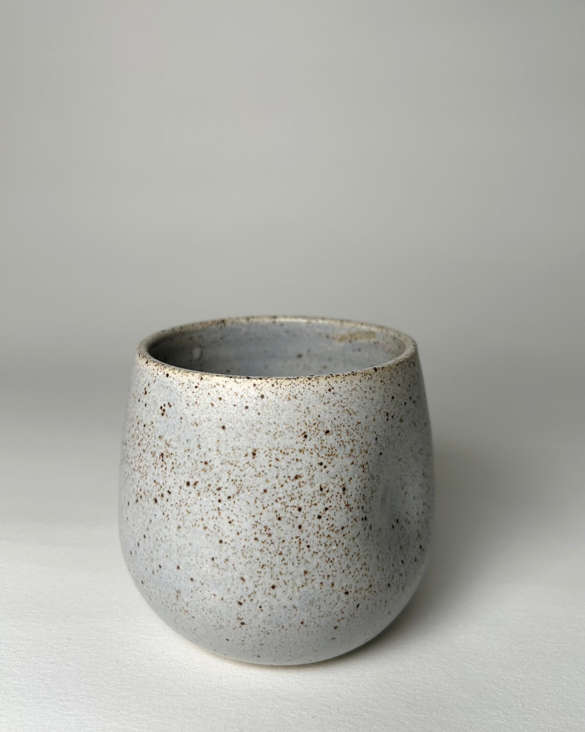 This tumbler has a gentle thumb imprint on one side and it is so very nice to hold. This cup has lots of wild speckles shining through its periwinkle blue glaze. Nice drips. Good for either cold or warm drinks. Microwave + Dishwasher safe.