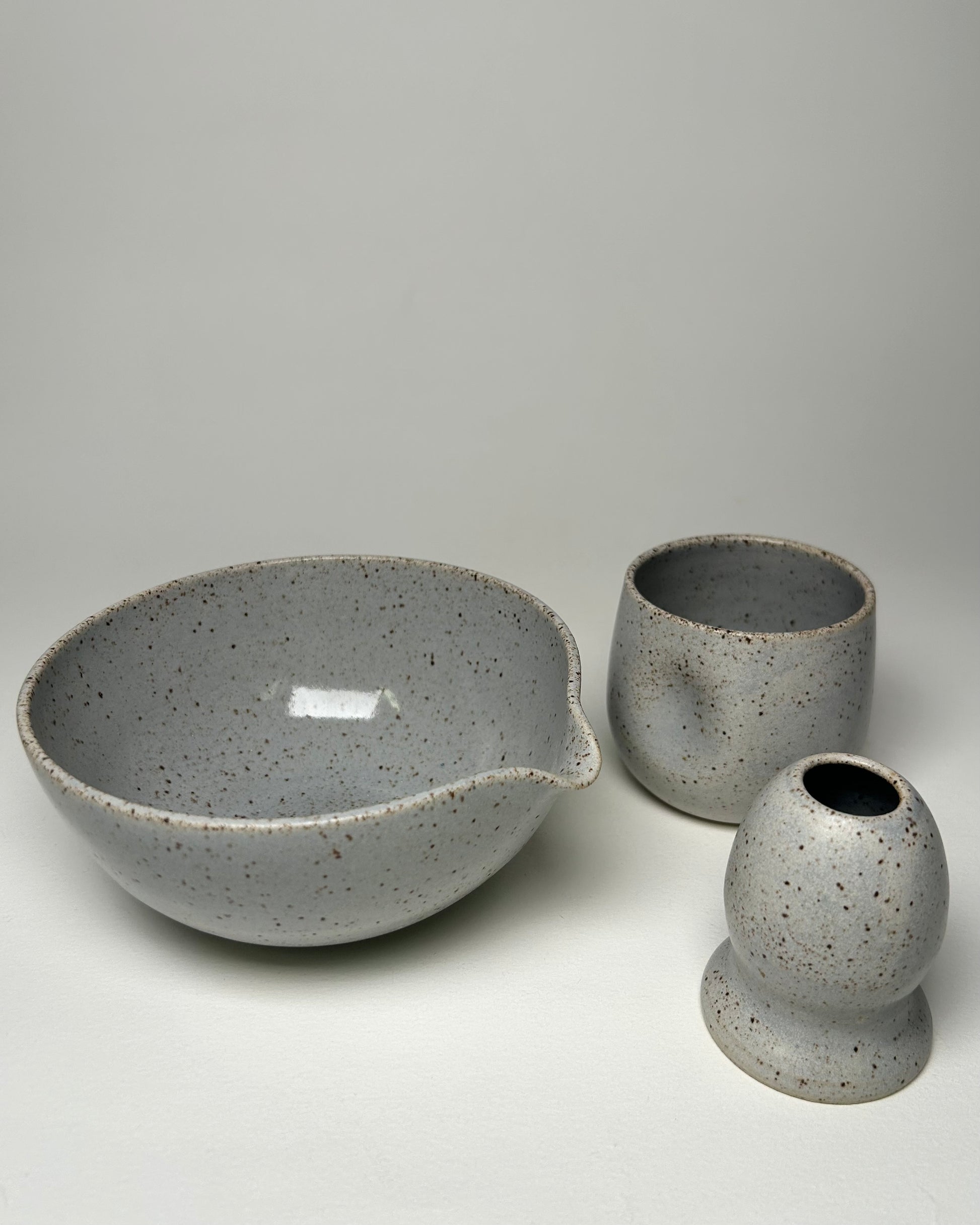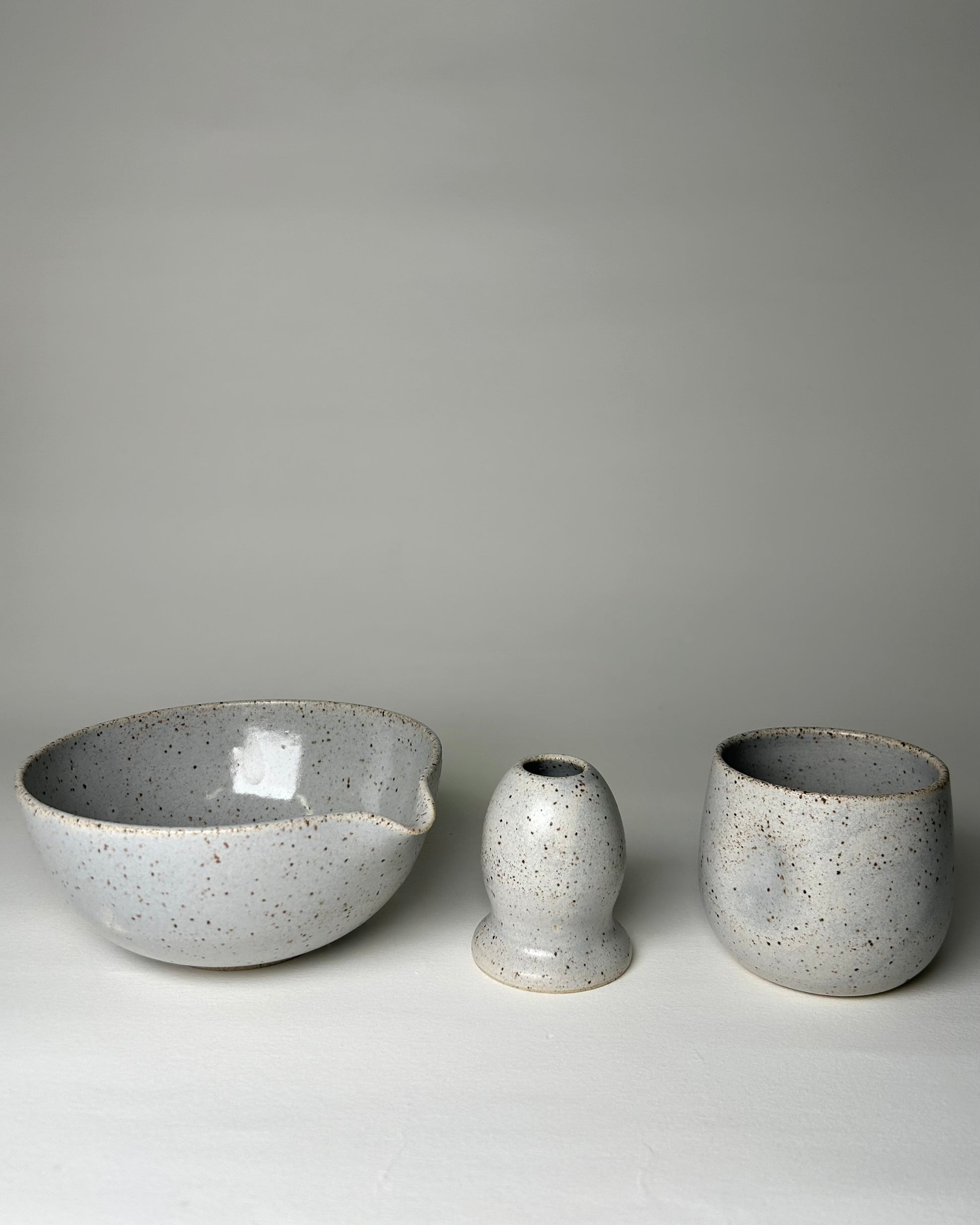 I have been making matcha sets as commissioned items this year and this is a prototype. It is a blue grey speckled beauty. This set includes a matcha bowl, whisk holder, and a dimple tumbler. Microwave + Dishwasher safe.