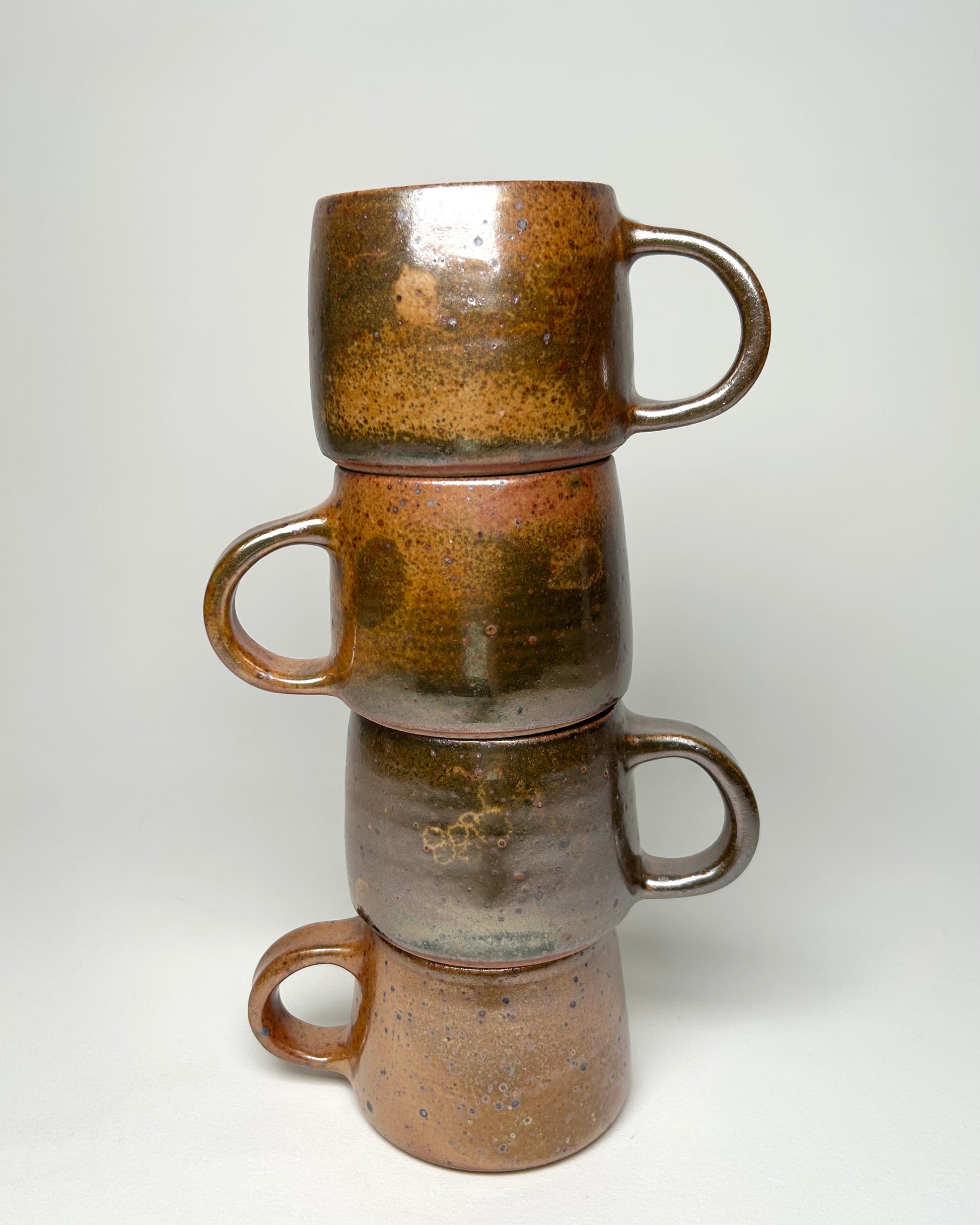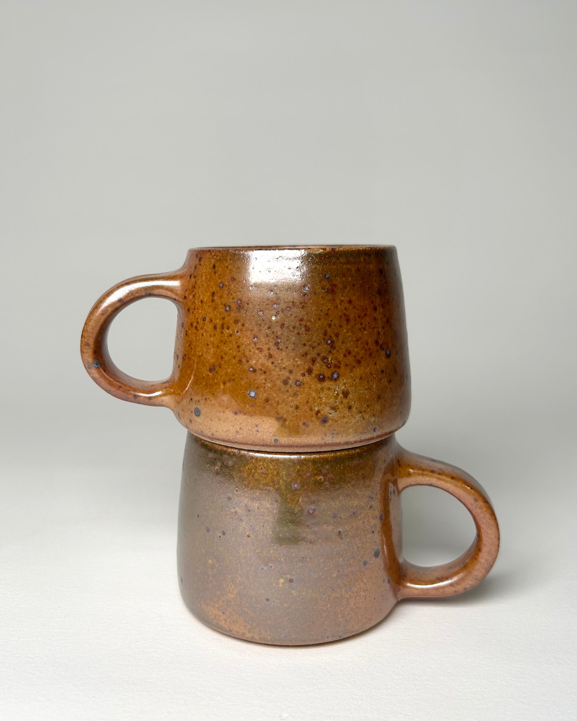 These small mugs are gas reduction fired which means each one has a unique glaze finish. The shino glaze has elements of: shiny orange, bright copper, brown speckles, light smokey patches, and hues of red. The shape of the mug is gentle tapered in.