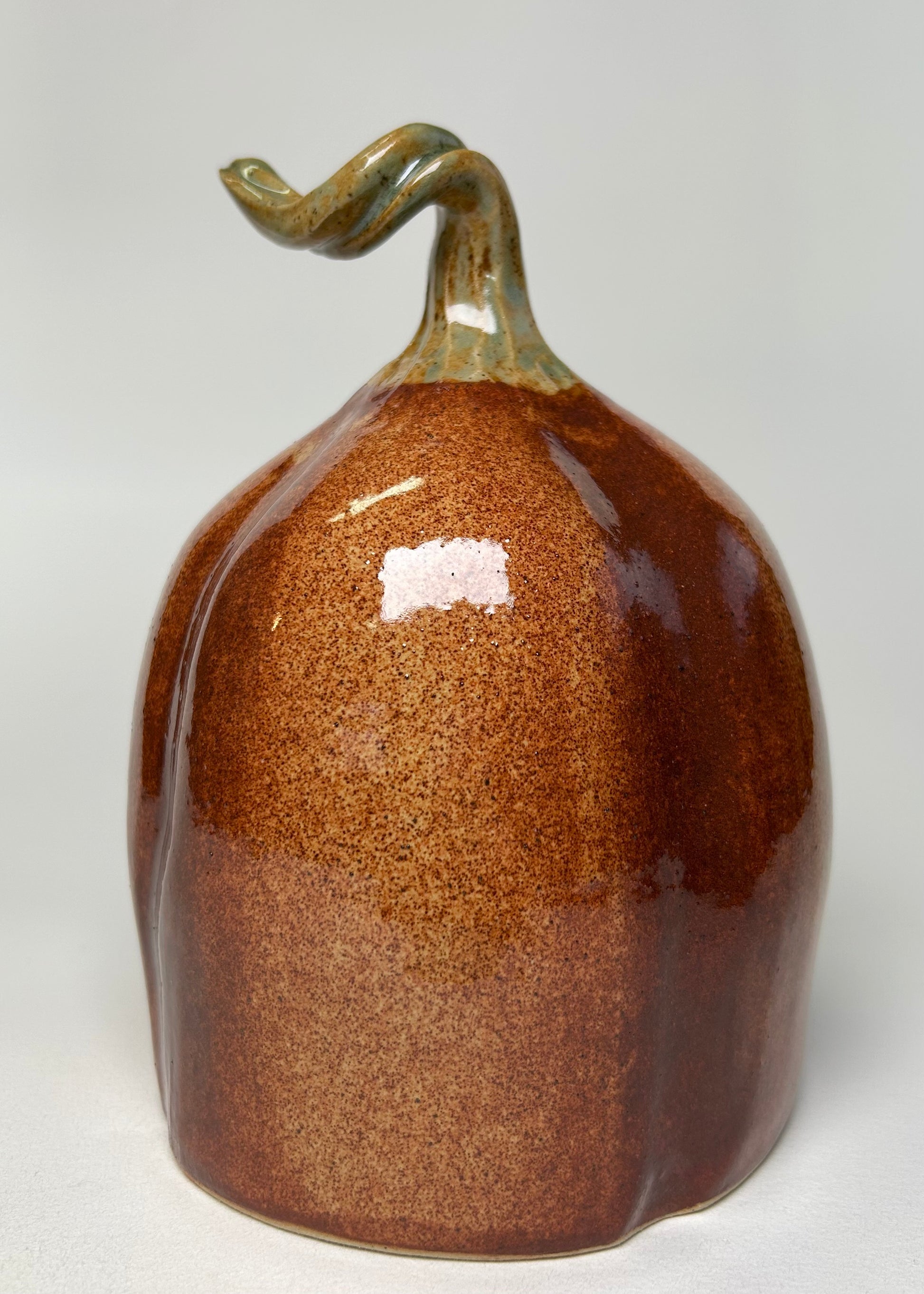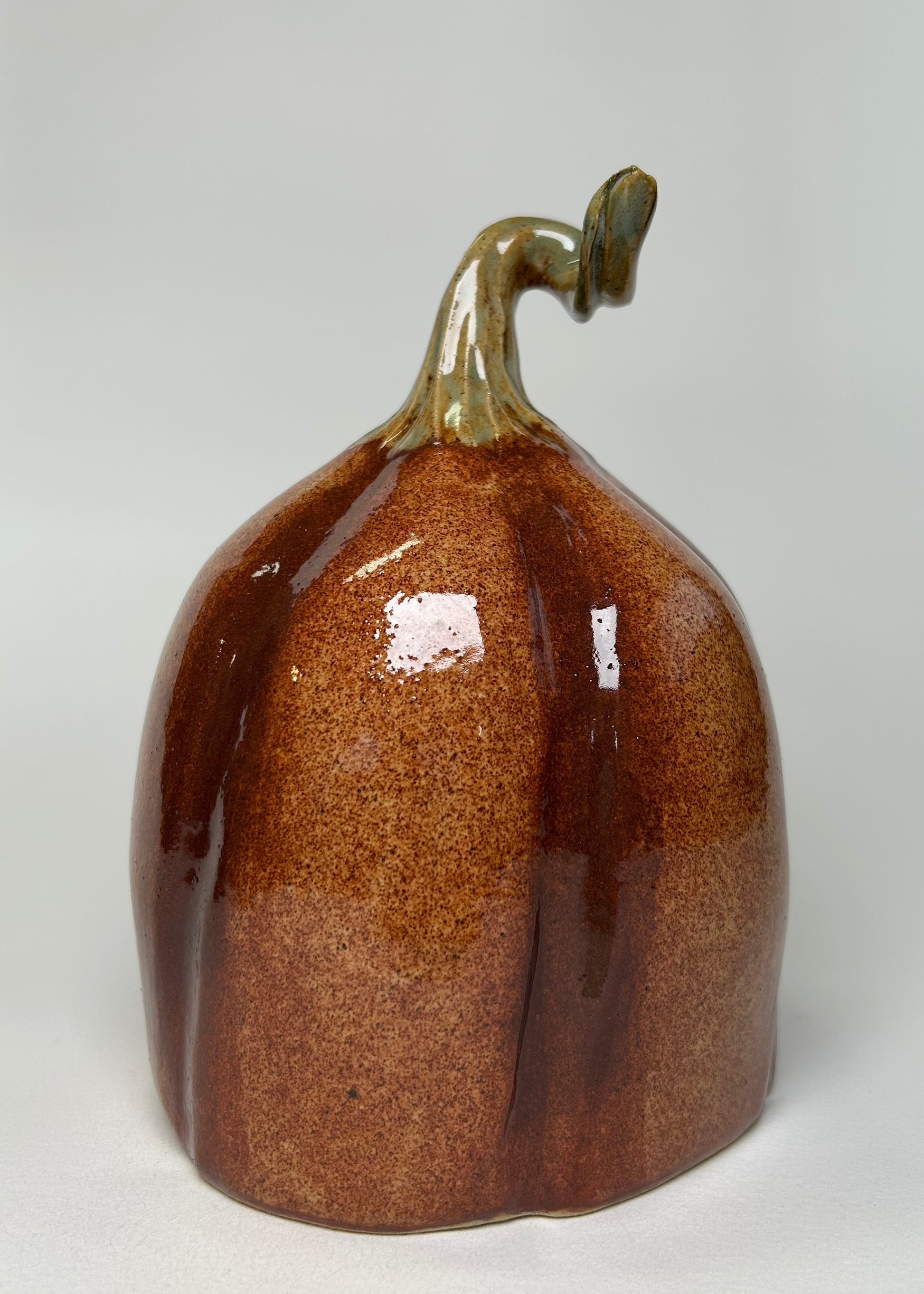 Shiny, handpainted stalk, airbrushed, and made with love. This pumpkin was glazed in a variegated rusty orange brown glaze.
