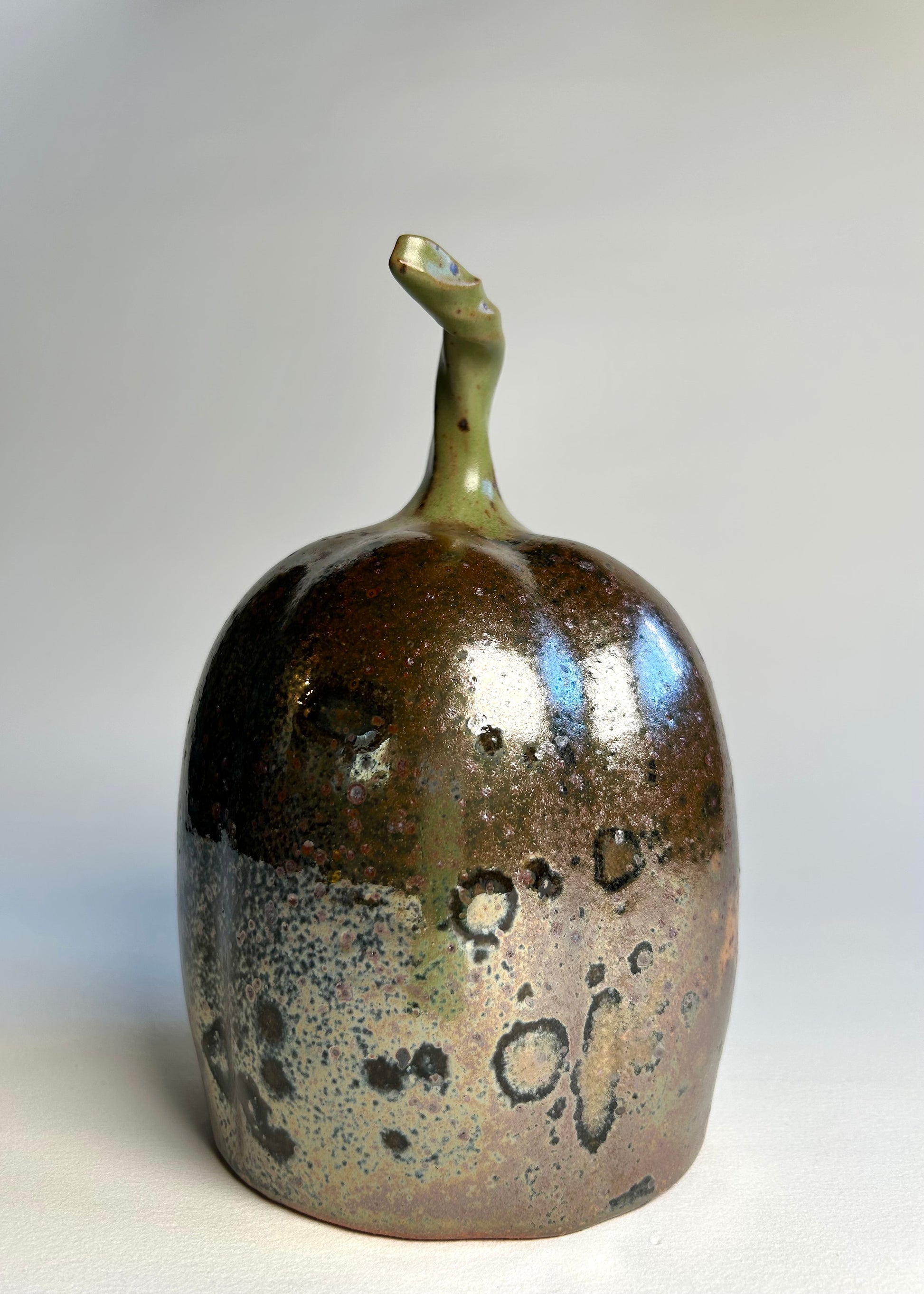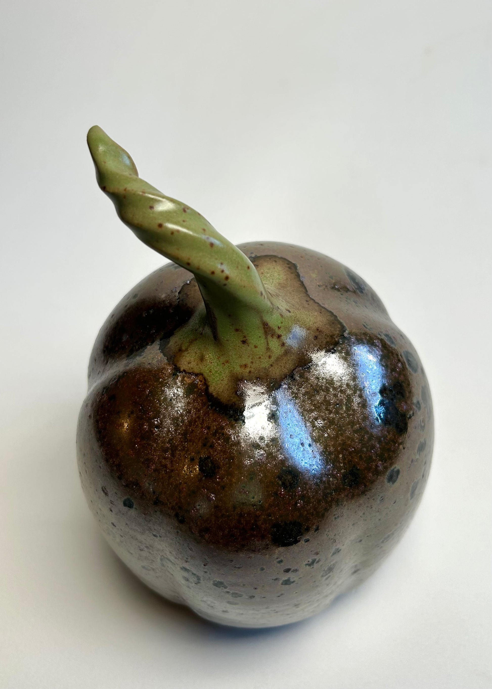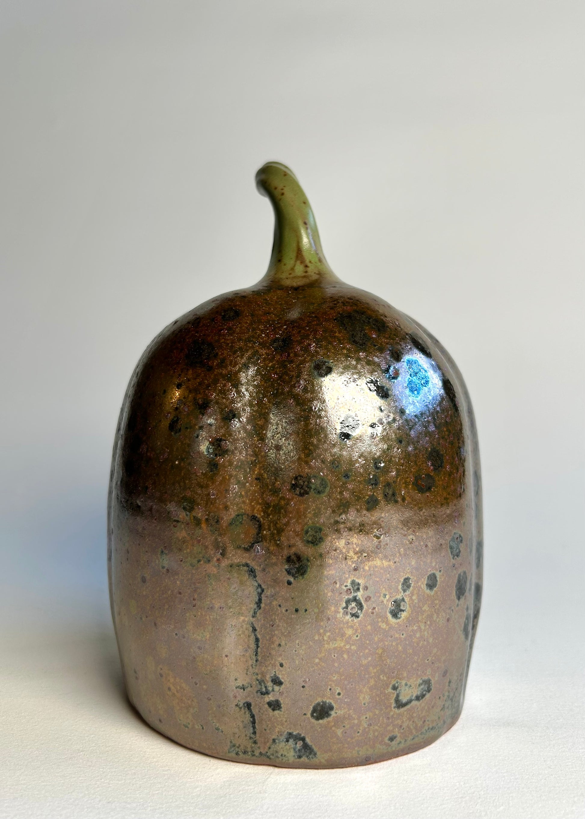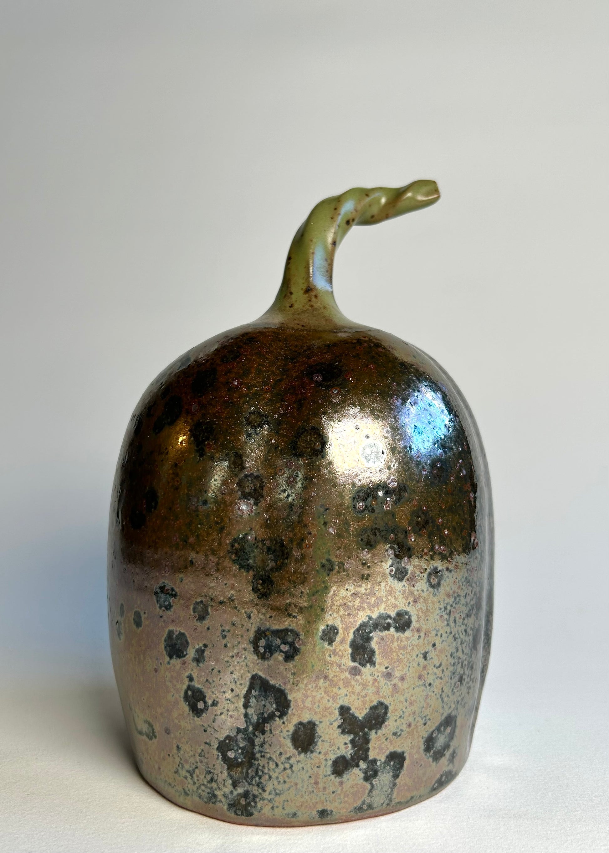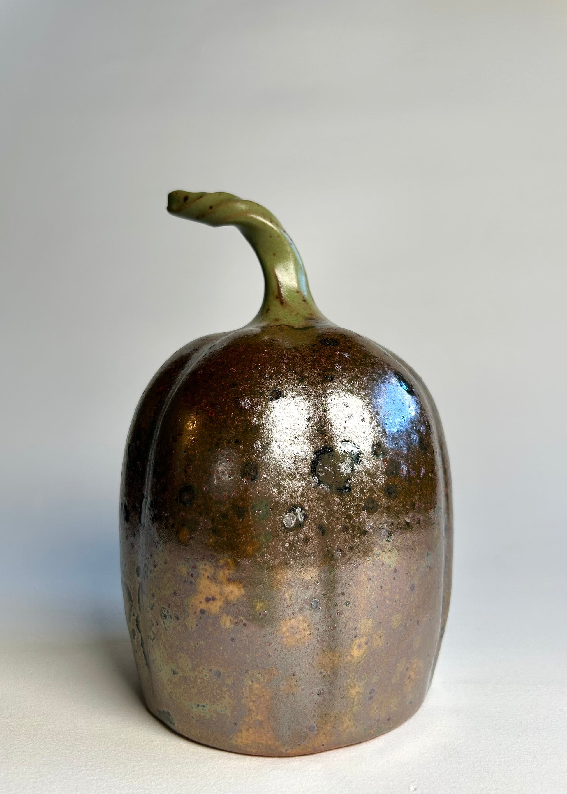 This pumpkin is very Halloween. It was gas fired in a reduction atmosphere. The glaze became somewhat metallic. Lots of speckles and pockets of black abound on its very shiny surface. It is one of a kind, I would have to get very lucky to replicate something like this.