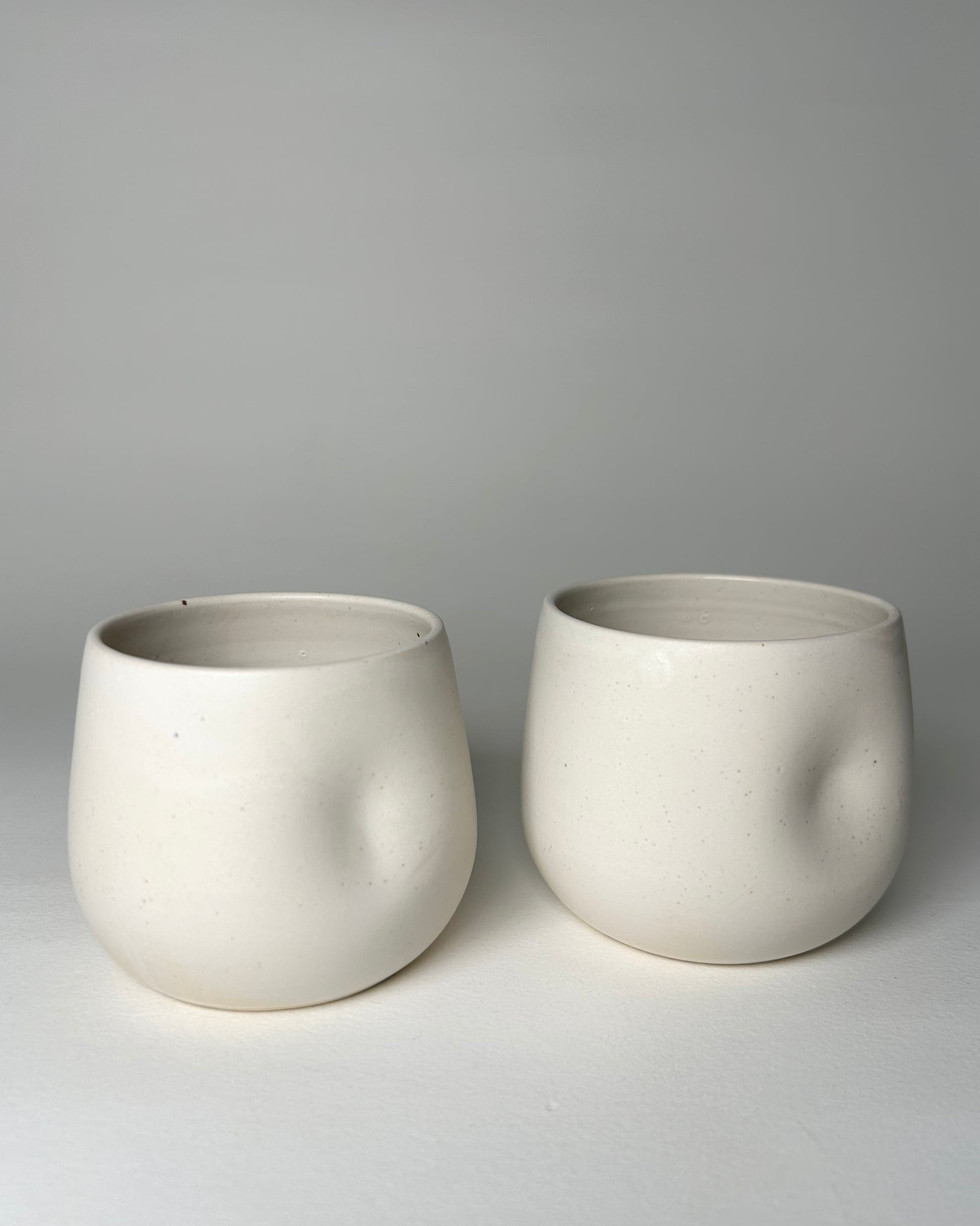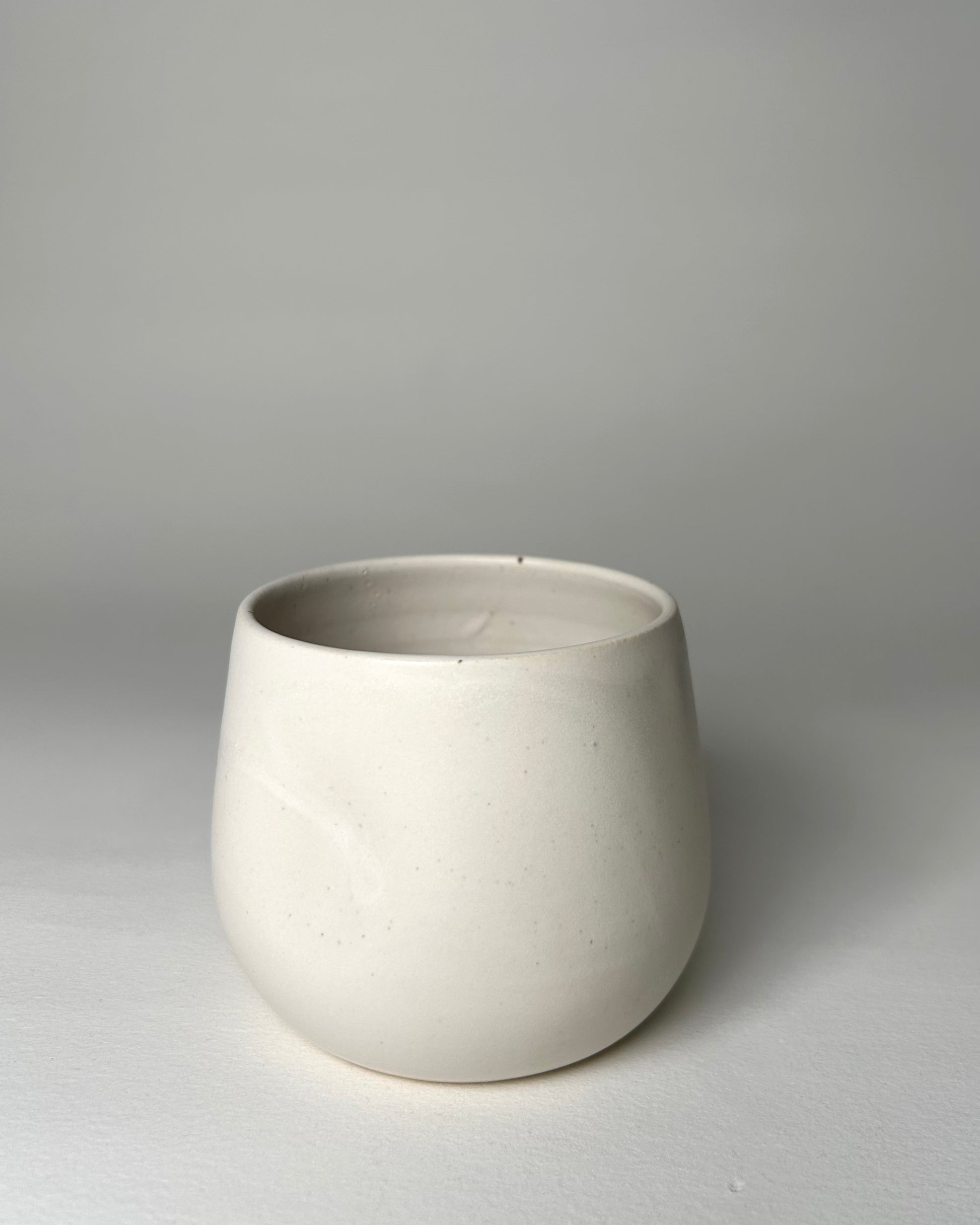 This matte white tumbler has a gentle thumb imprint on one side which is nice to hold. This cup is good for either cold or warm drinks. I will be the first to tell you that the odd speckle got through, as seen in the photos. Microwave + Dishwasher safe.